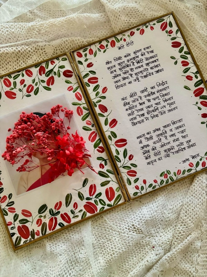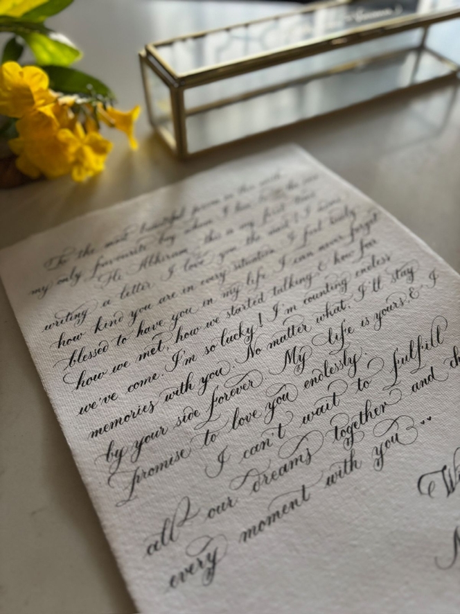 From heartfelt love letters and elegant nameplates to beautifully rendered Hindi poems and mantra frames, we specialize in personalized calligraphy.