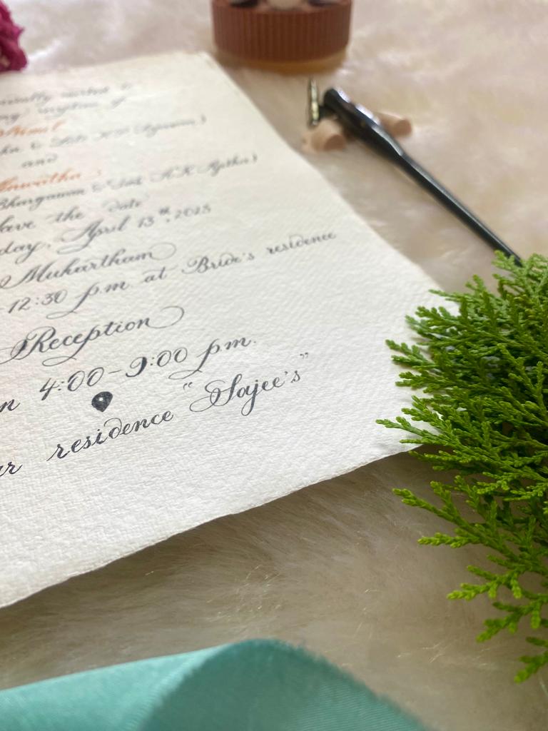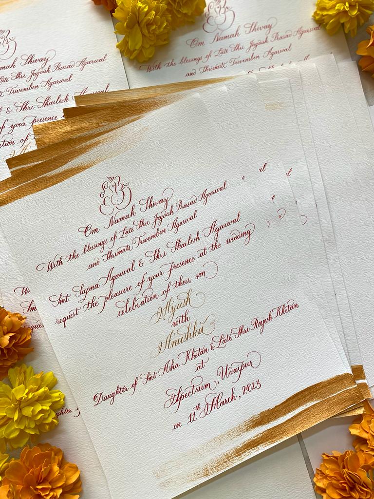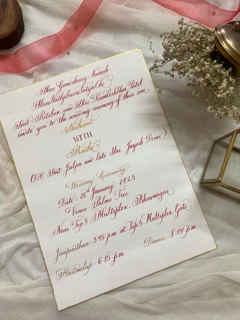 Handwritten wedding cards in calligraphy are a beautiful and personalized way to invite guests to a wedding. Calligraphy adds a touch of elegance and sophistication to the invitations, creating a romantic and timeless look. With a range of styles and materials available, calligraphy is a unique and memorable way to celebrate the special day.